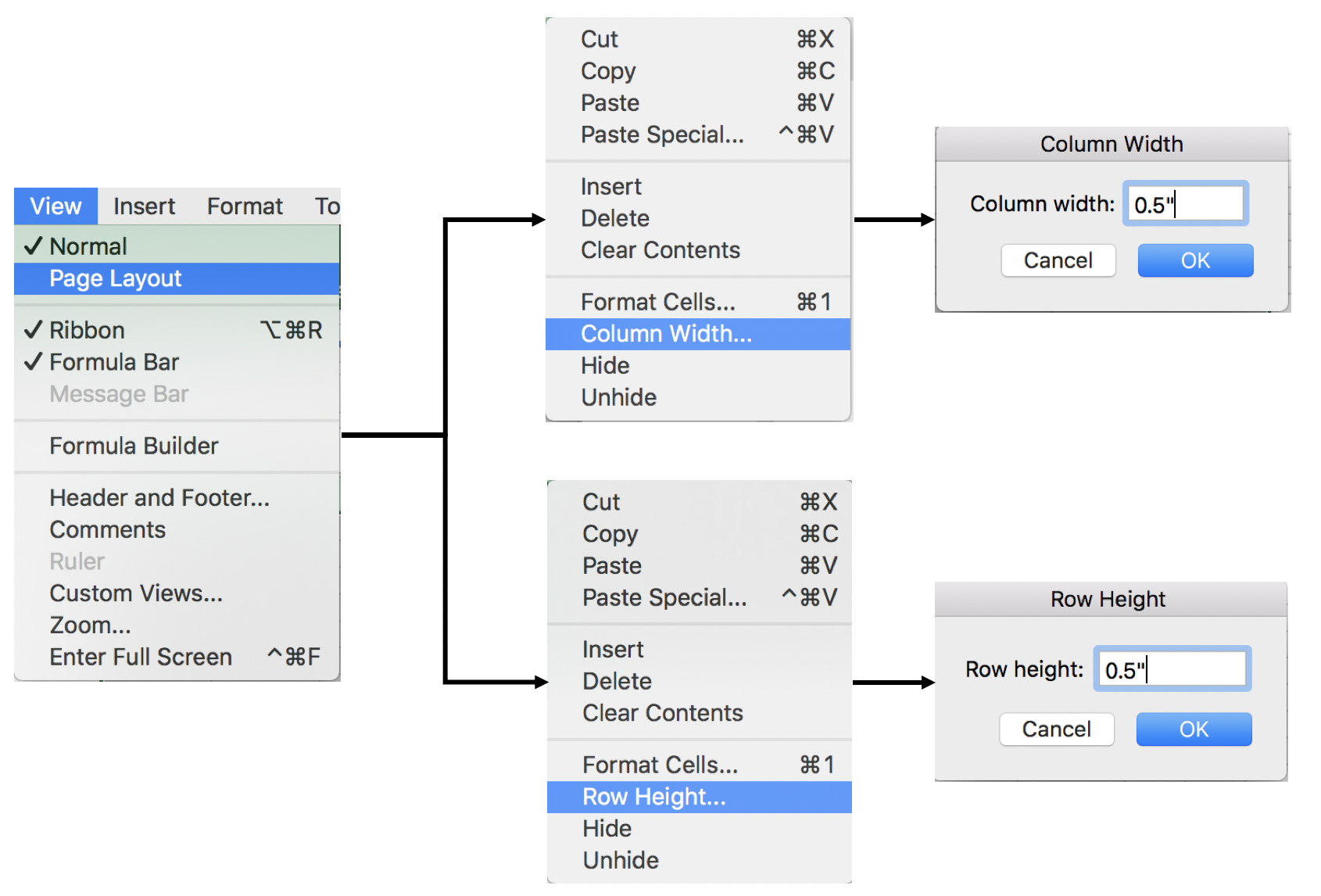 In Excel, we want to create a 10 by 10 square grid. To do this, change your view from Normal to Page Layout. We are doing this because Excel has a unique way of measuring row and height size (they are not on the same scale under the Normal view). When you change to the Page Layout, the scales for the columns and rows are in inches. Set the size for the columns and rows to 0.5 inch. You should have a 10 by 10 grid with squared that have a height and length of 0.5 inch.