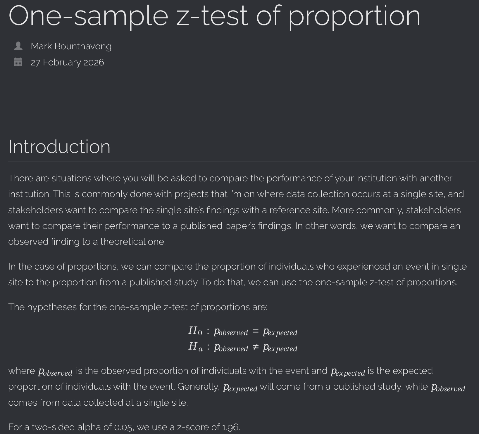 In the case of proportions, we can compare the proportion of individuals who experienced an event in single site to the proportion from a published study. To do that, we can use the one-sample z-test of proportions.